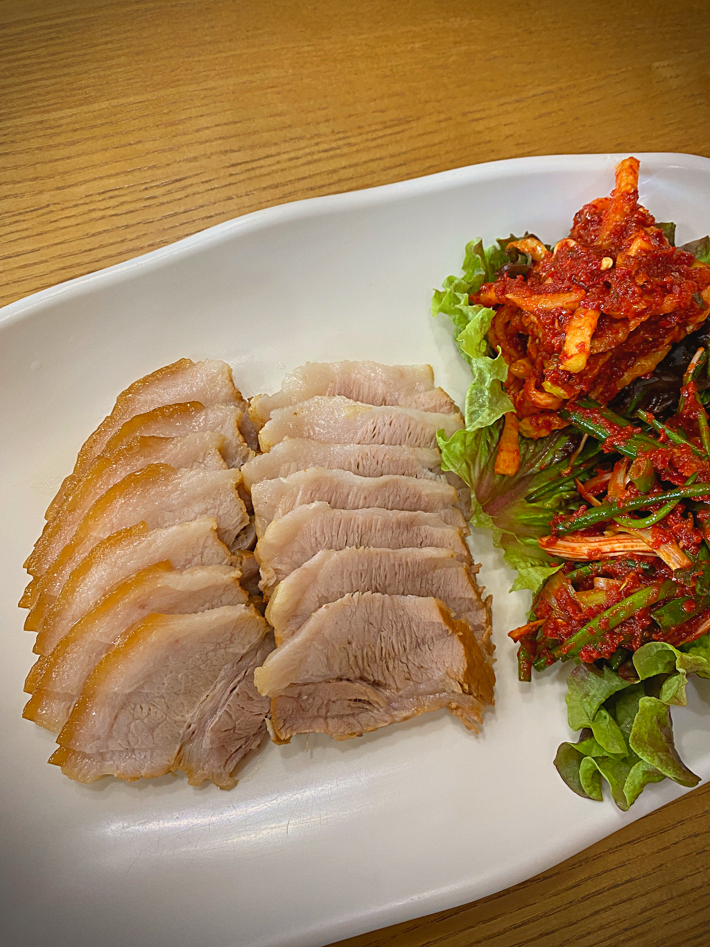 옆테이블을 봤더니 백김치를 다들 한접시 시켜놓고 같이 먹는다. 나중에 알았지만 이 집의 별미는 잘 익은 백김치에 싸 먹는 수육이랜다. 접수완료.