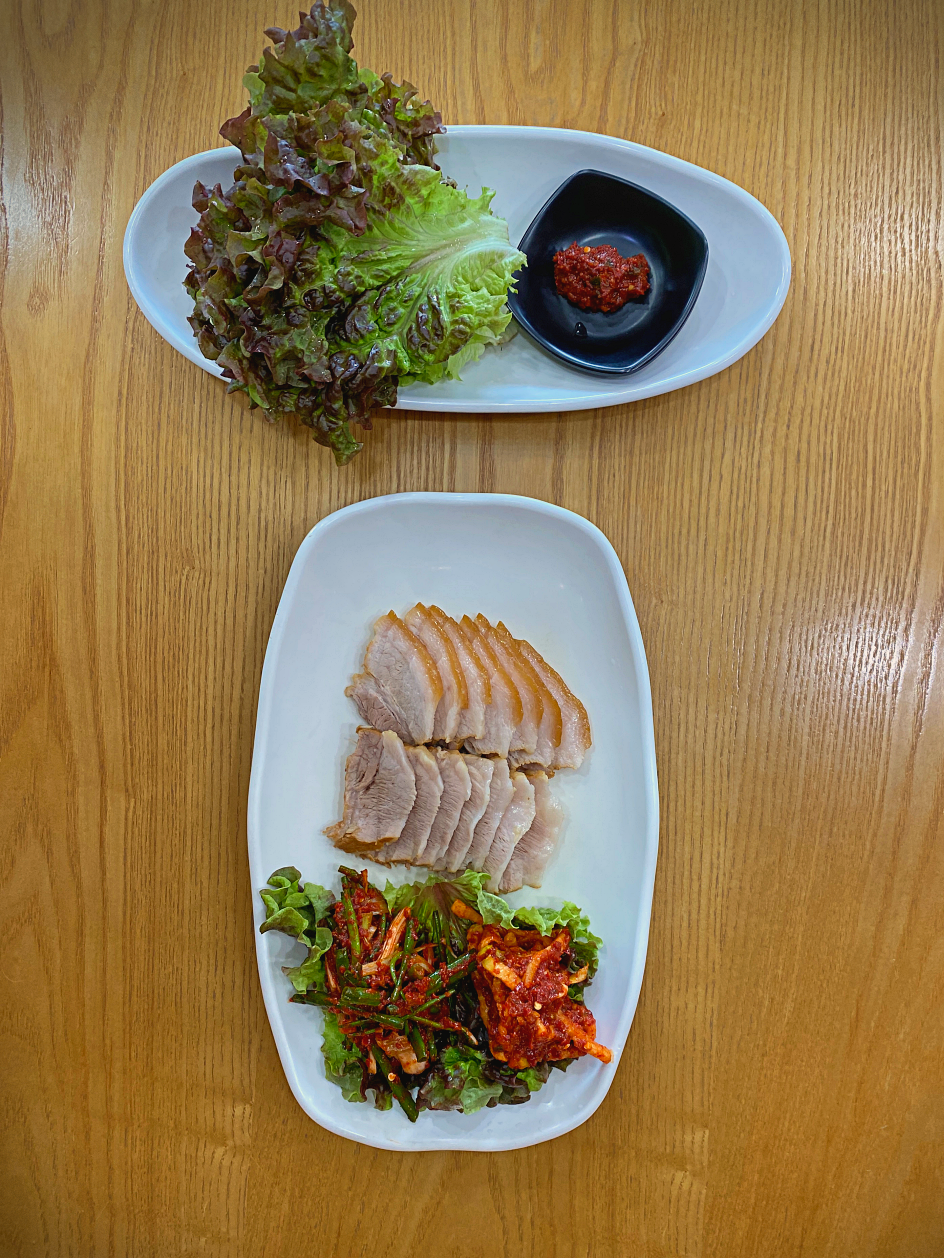 줄맞춰 접시에 담긴 수육반접시, 뭘 이렇게까지 내 취향인지. 기분 좋은 한창 차림이다.