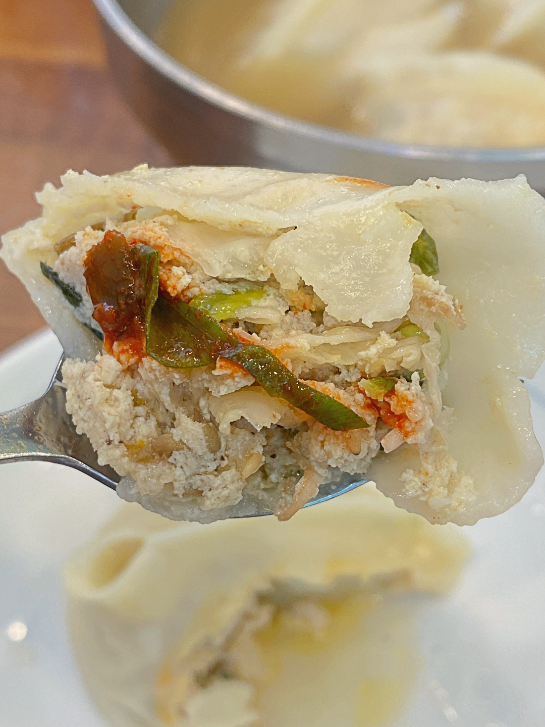 숟가락 가득담긴 만두를 조심히 앞접시에 가져와 반으로 톡 잘라본다. 부풀었던 만두피가 꺼지면서 두부와 숙주가 쏟아져 나왔다. 이북식 만두는 만두피가 두꺼워서 씹는 맛이 일품이다. 전체적으로 간이 세지 않고 담백한 맛이 특징.