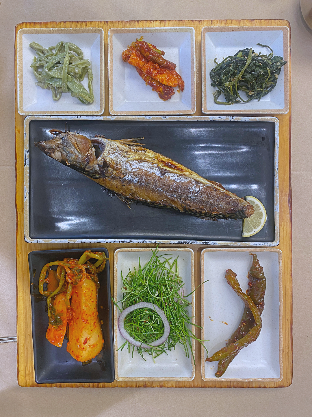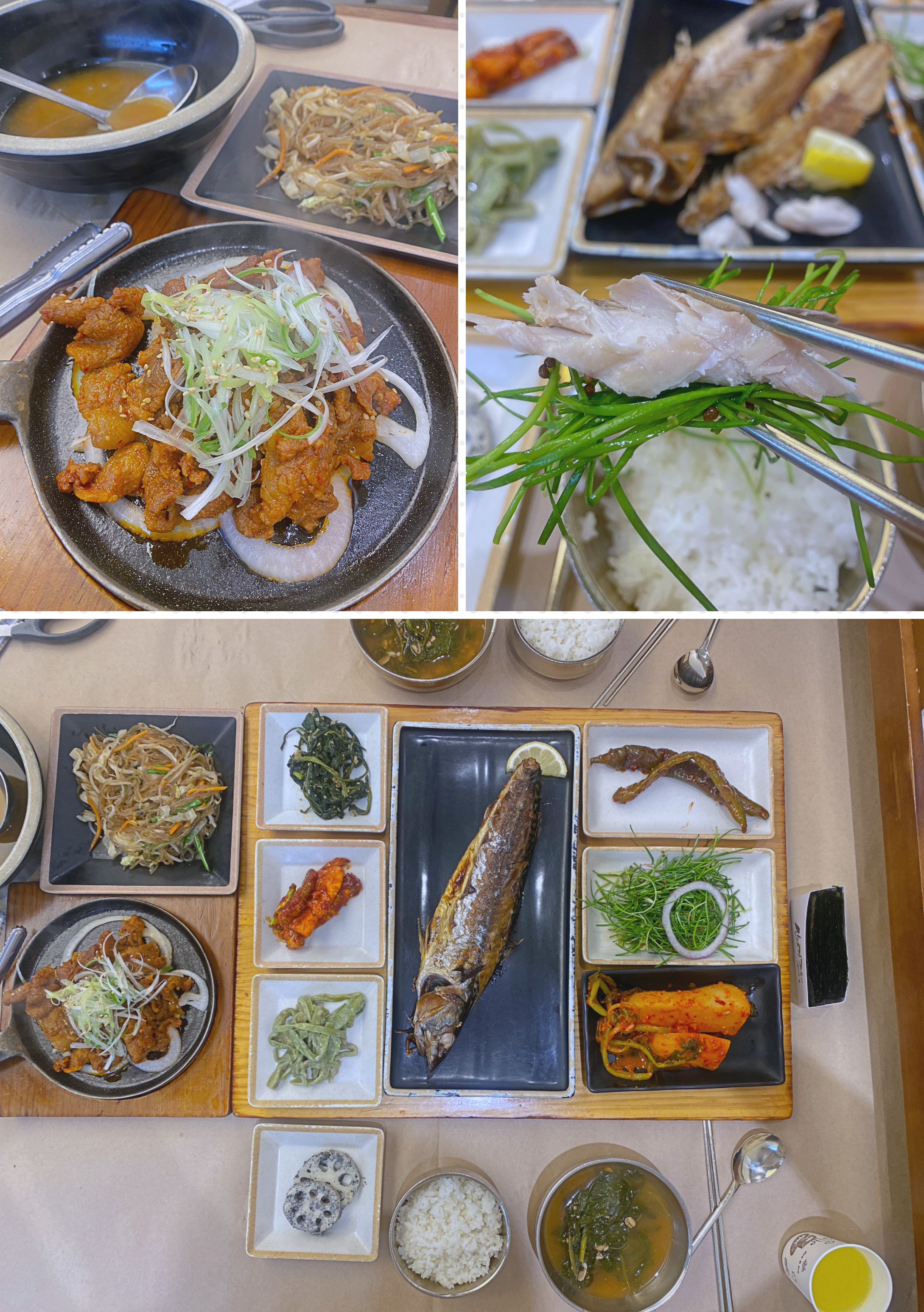 가기 전부터 나의 1순위는 총각김치. 알싸하게 맵고 아삭한 무를 상상했는데 시큼하고 물컹한 식감이라 아쉬웠다. 의외로 괜찮았던 건 부추 샐러드. 생선에 올려먹거나 김에 싸 먹기만 해도 푸릇한 맛이 올라와 입맛을 돋웠다.